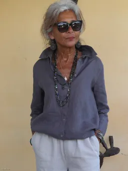 Taupe linen shirt for women with 3/4 sleeves and pocketless....