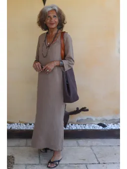 The 100% linen coffee long sleeve V-neck long dress, length...