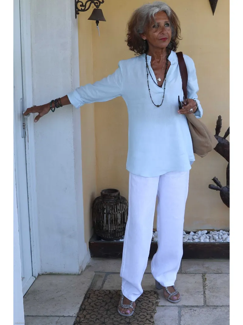 Let yourself be tempted by this 3/4-sleeve sky blue linen top for an elegant, casual look. Pocketless, with 3/4 sleeves and a V-neck, this lightweight linen top is available in 5 sizes. Washable at 30° and easy to iron, this sky blue linen top will play an active part in your well-being.